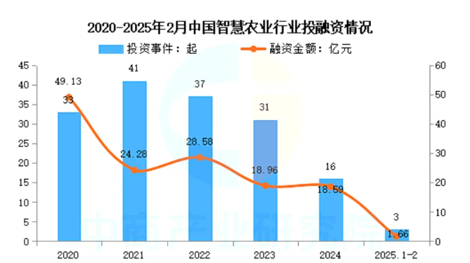 近年來,中國智慧農(nóng)業(yè)行業(yè)投資事件數(shù)量及規(guī)模整體呈波動上升趨勢。IT桔子數(shù)據(jù)顯示,2024年我國智慧農(nóng)業(yè)投資數(shù)量16起,已披露融資金額達18.59億元。2025年1-2月我國智慧農(nóng)業(yè)投資數(shù)量3起,已披露融資金額達1.66億元。